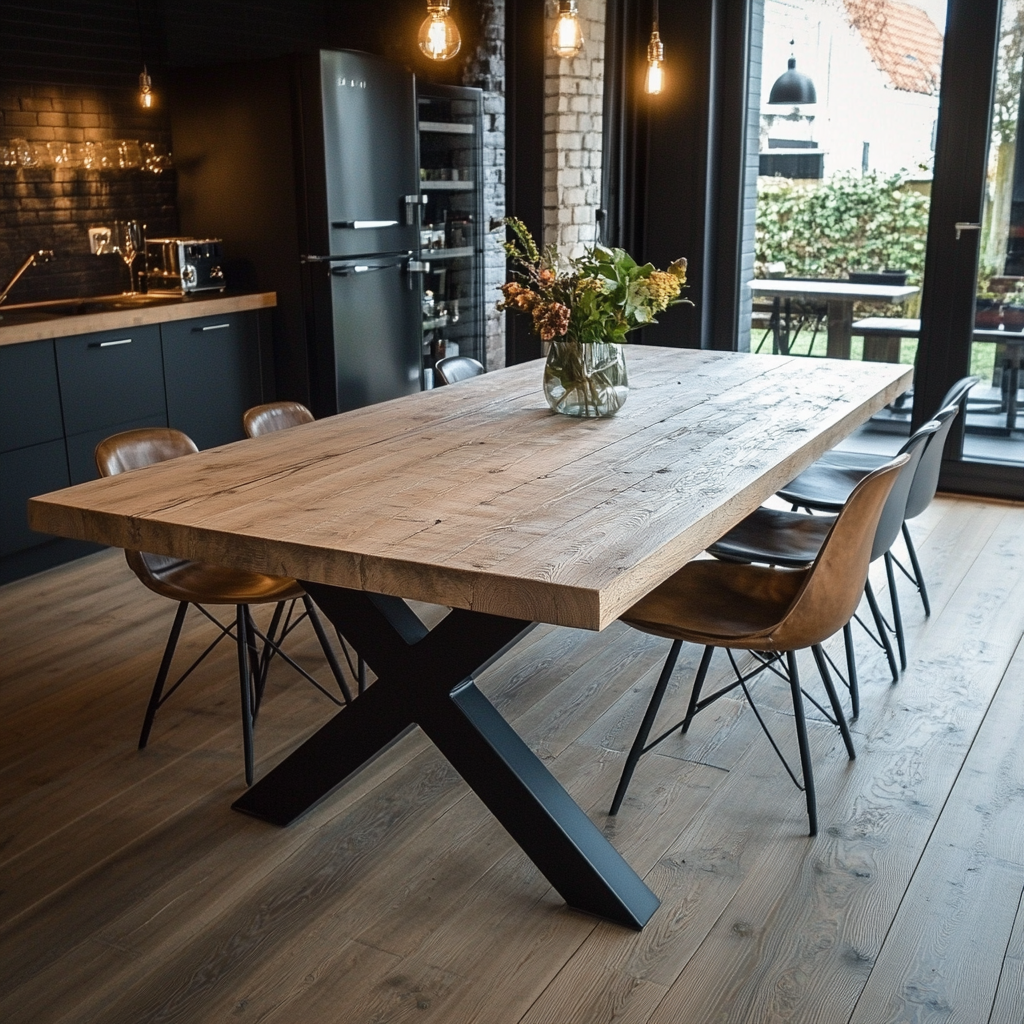 Grote eettafel met karakter, essen houten blad en stoere X-poot